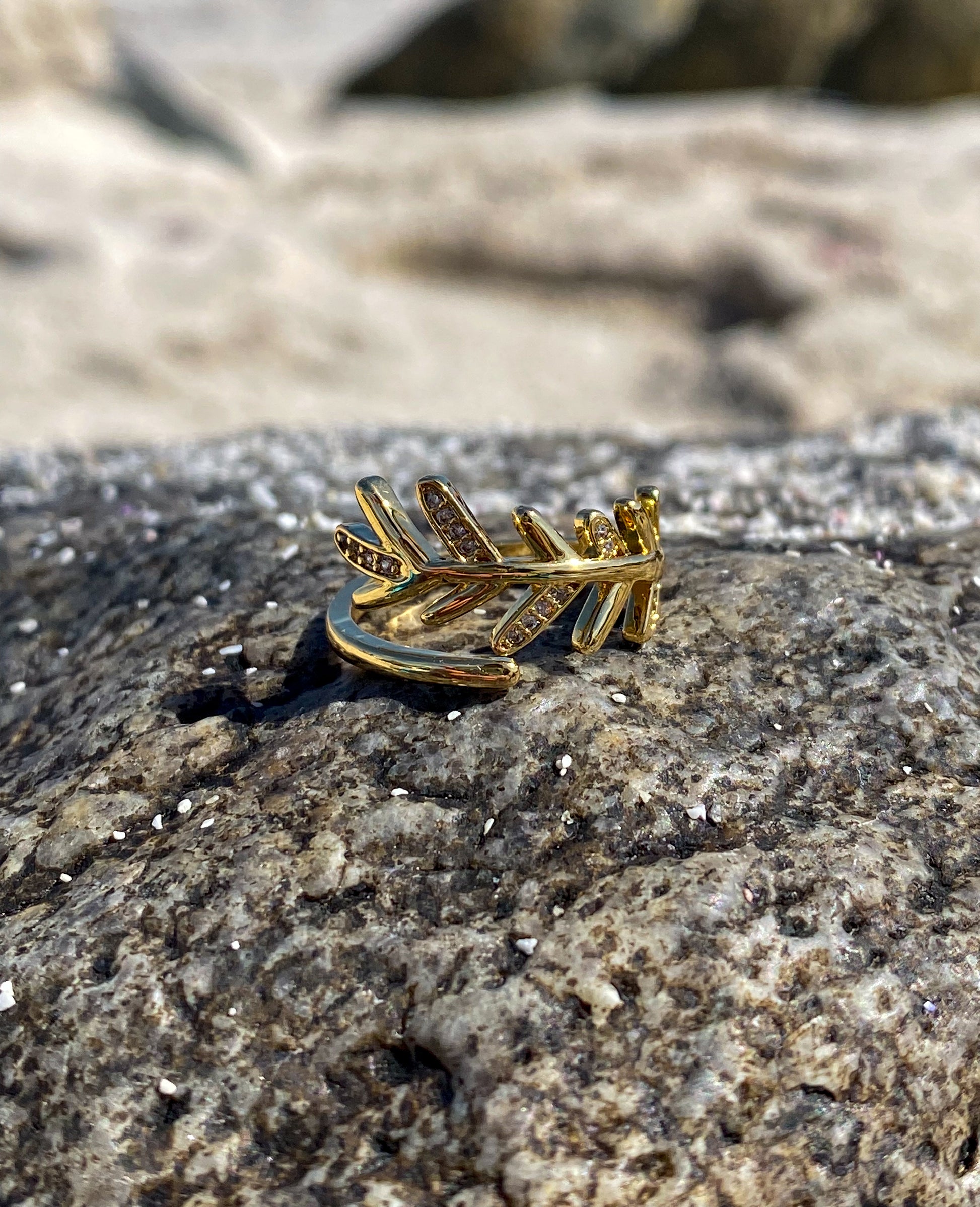 Anillo con doble laminado de oro de 18k en forma de ramas con circones blancos, ajustable