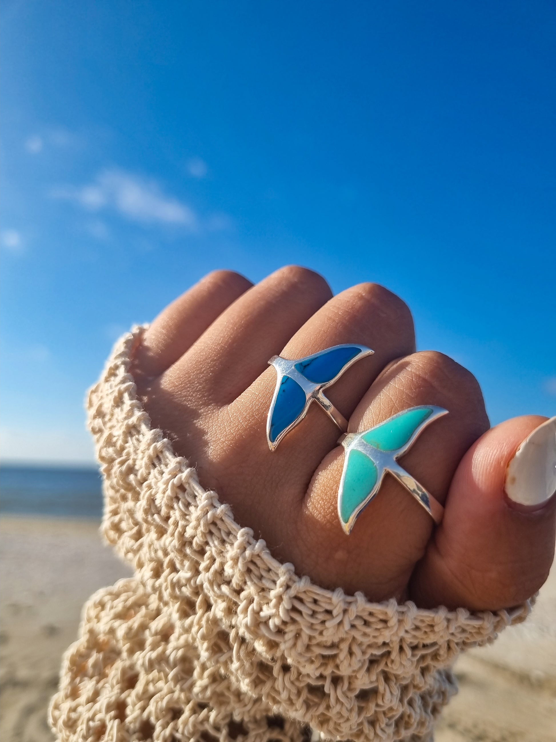 Anillo en forma de cola de ballena con turquesa celeste, hecha en plata 925. Realmente hermosa.