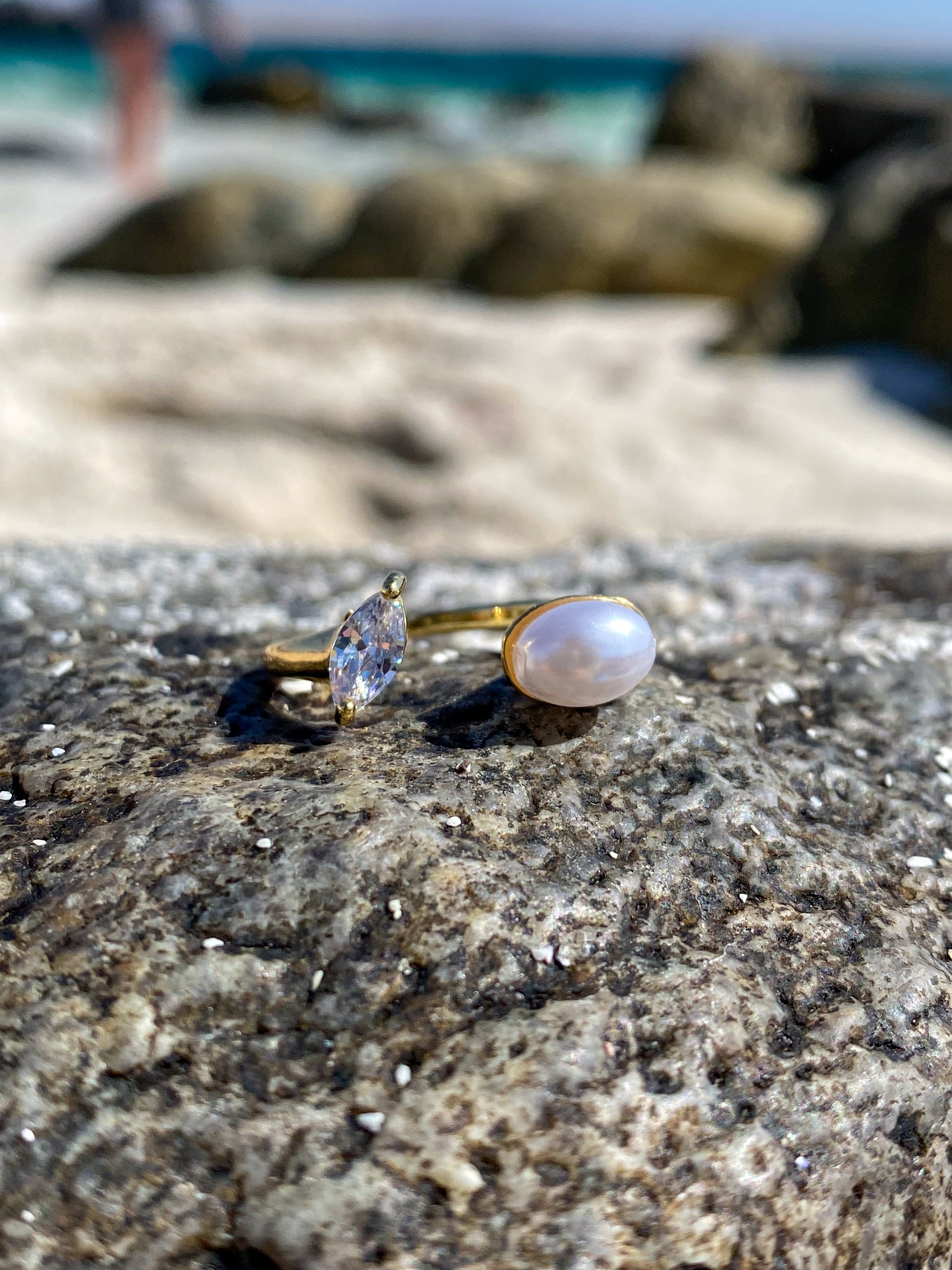 Anillo dorado con perla y circón ovalado