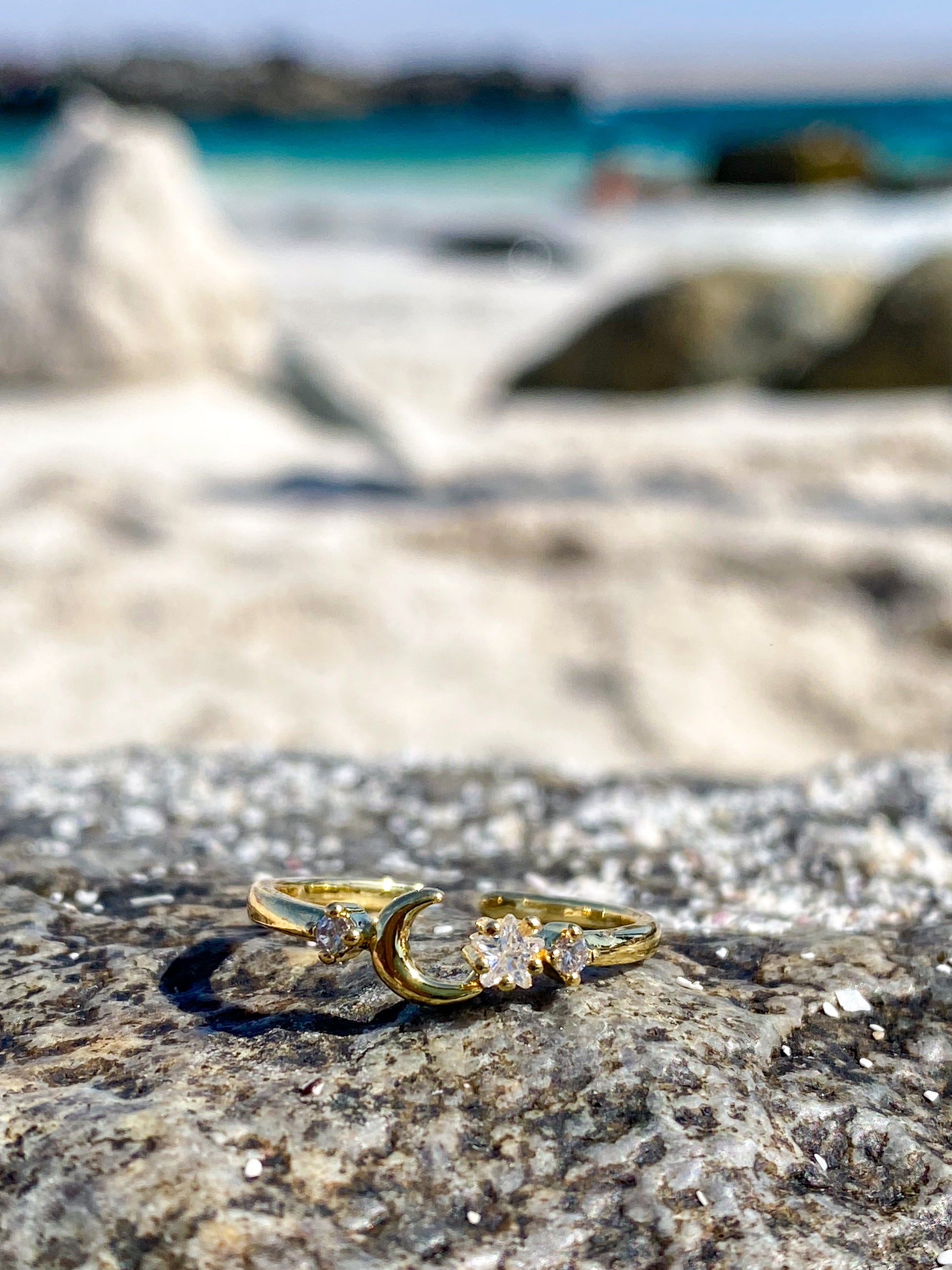 Anillo dorado ajustable con doble laminado de oro de 18 quilates con forma de media luna y un circón blanco en forma de estrella junto a dos circones blancos redondos
