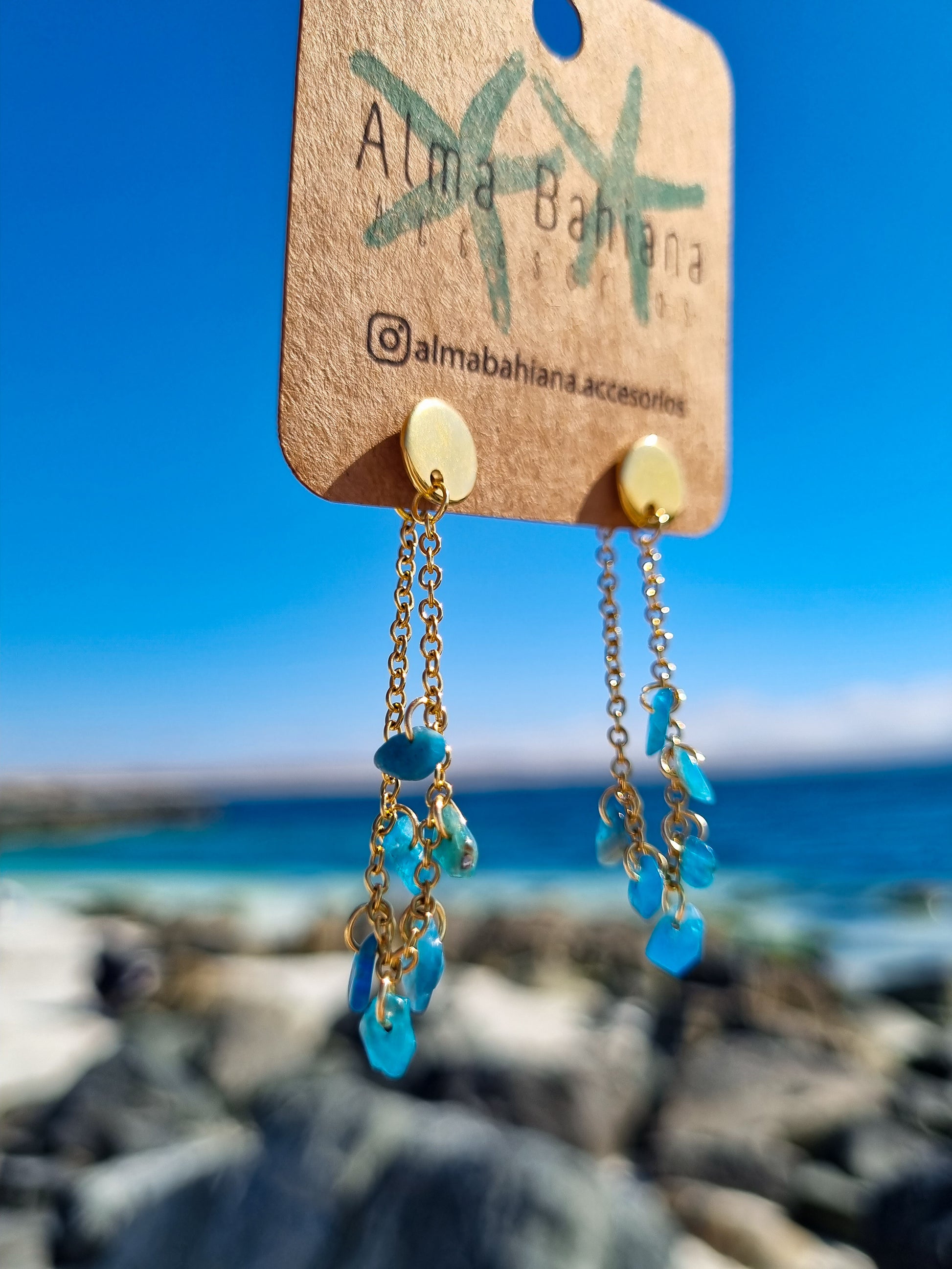 Aros bañados en oro de 18k con piedras apatita, la cadenita va amarrada al arito y al tornillo por lo que da toda la vuelta.