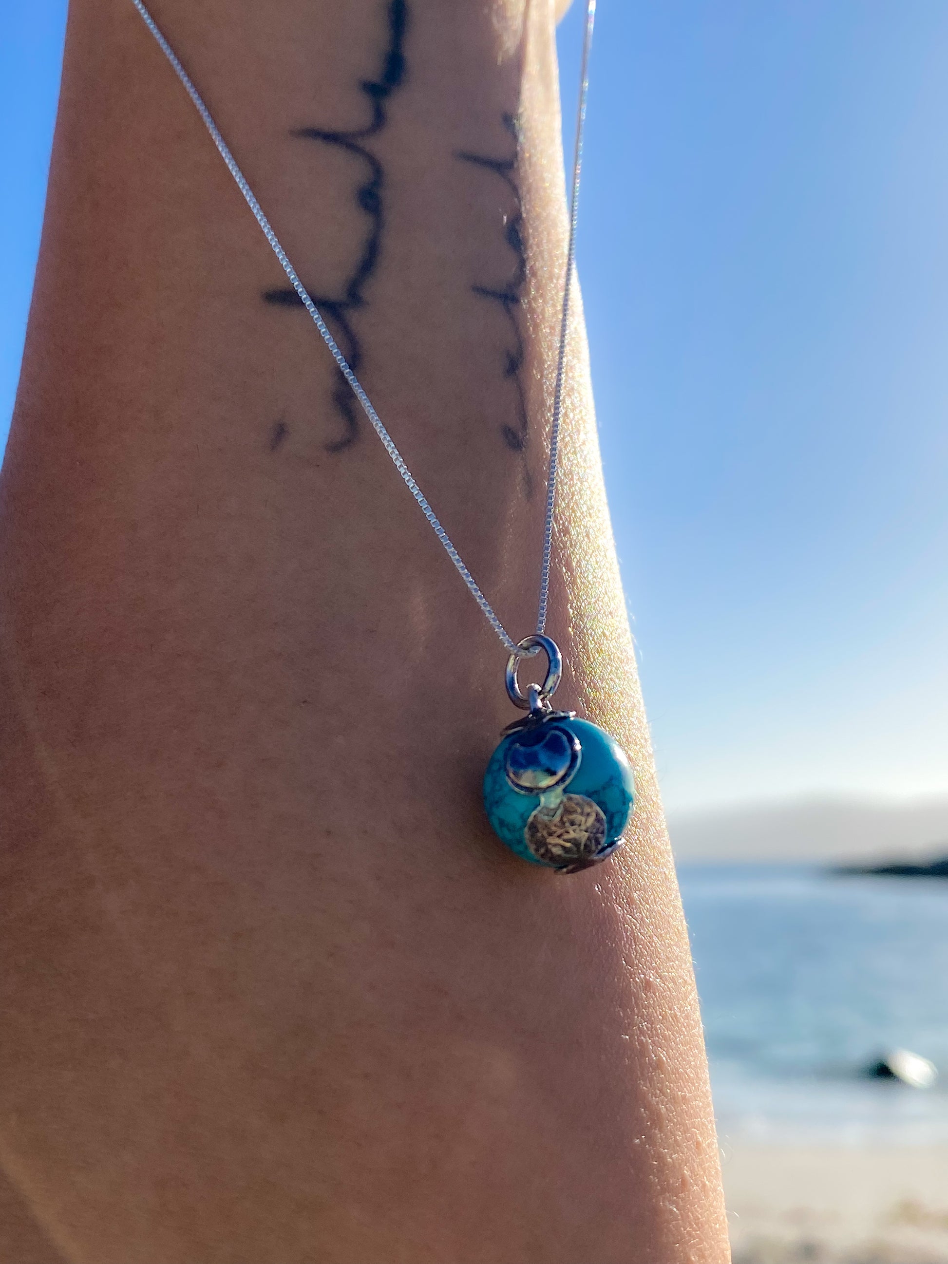 Brilla con el collar esfera turquesa ciclo de la luna! Elaborado en plata 925, cuenta con una hermosa esfera de piedra turquesa y un diseño que simboliza el ciclo lunar. Añade un toque bohemio y mágico a cualquier atuendo. ¡Perfecto para las amantes de la luna!