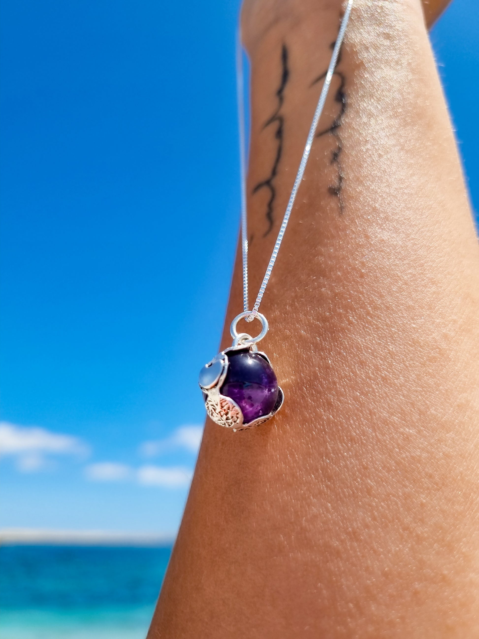 Este collar de esfera de Amatista con diseño de fases de la luna en plata 925 es hermosa! Con esta pieza única, siempre llevarás un pedazo del cielo contigo. (¡También es el regalo perfecto para esa amiga bohemia y soñadora!) La esfera gira por lo que puedes jugar y cumple una función antiestres.